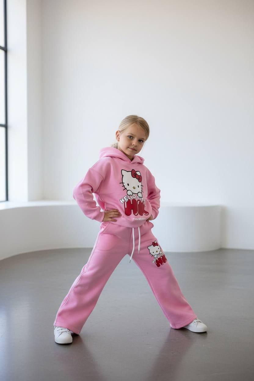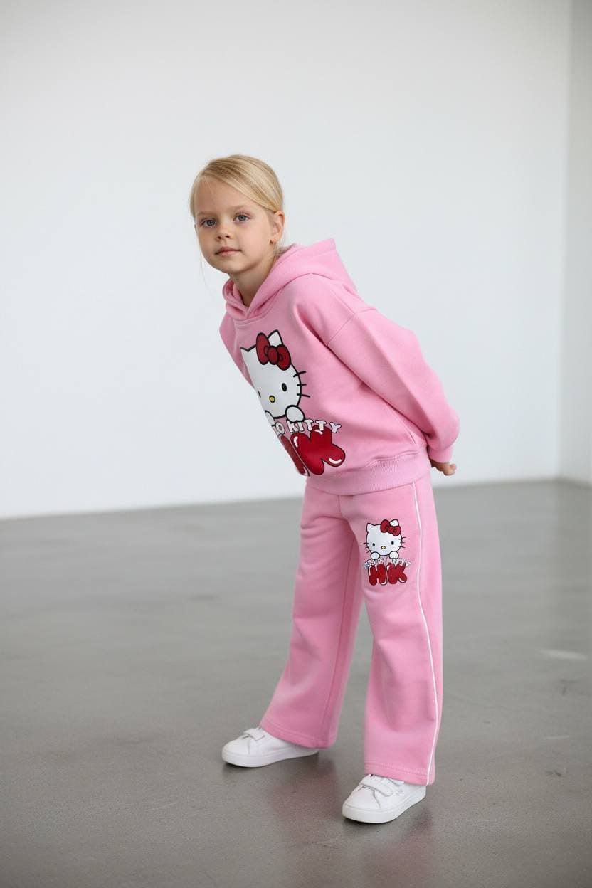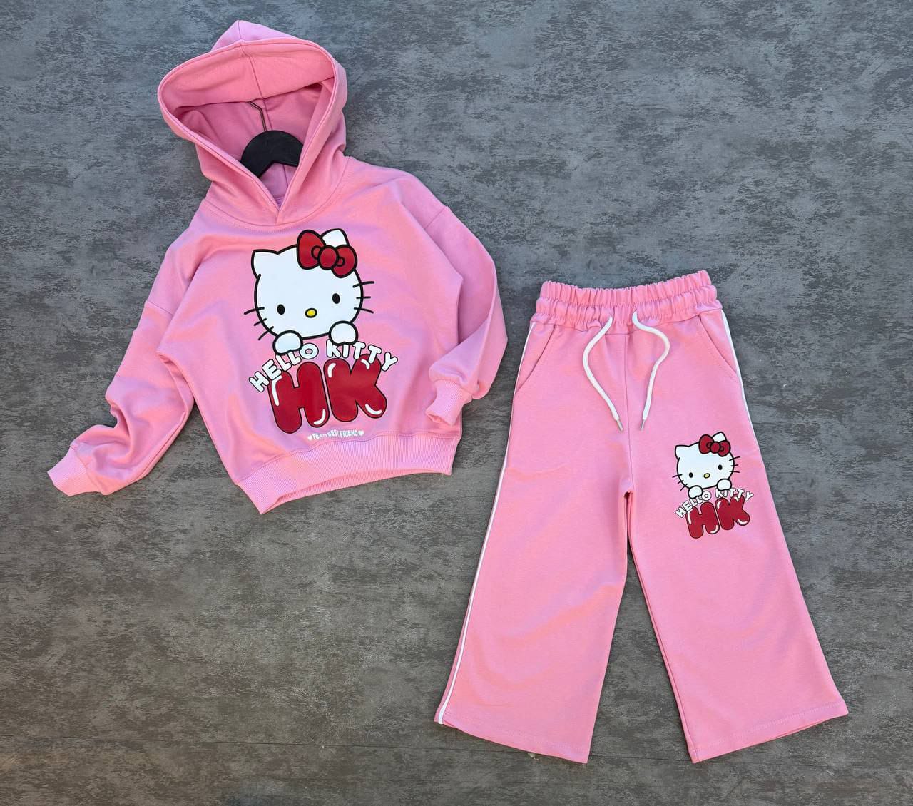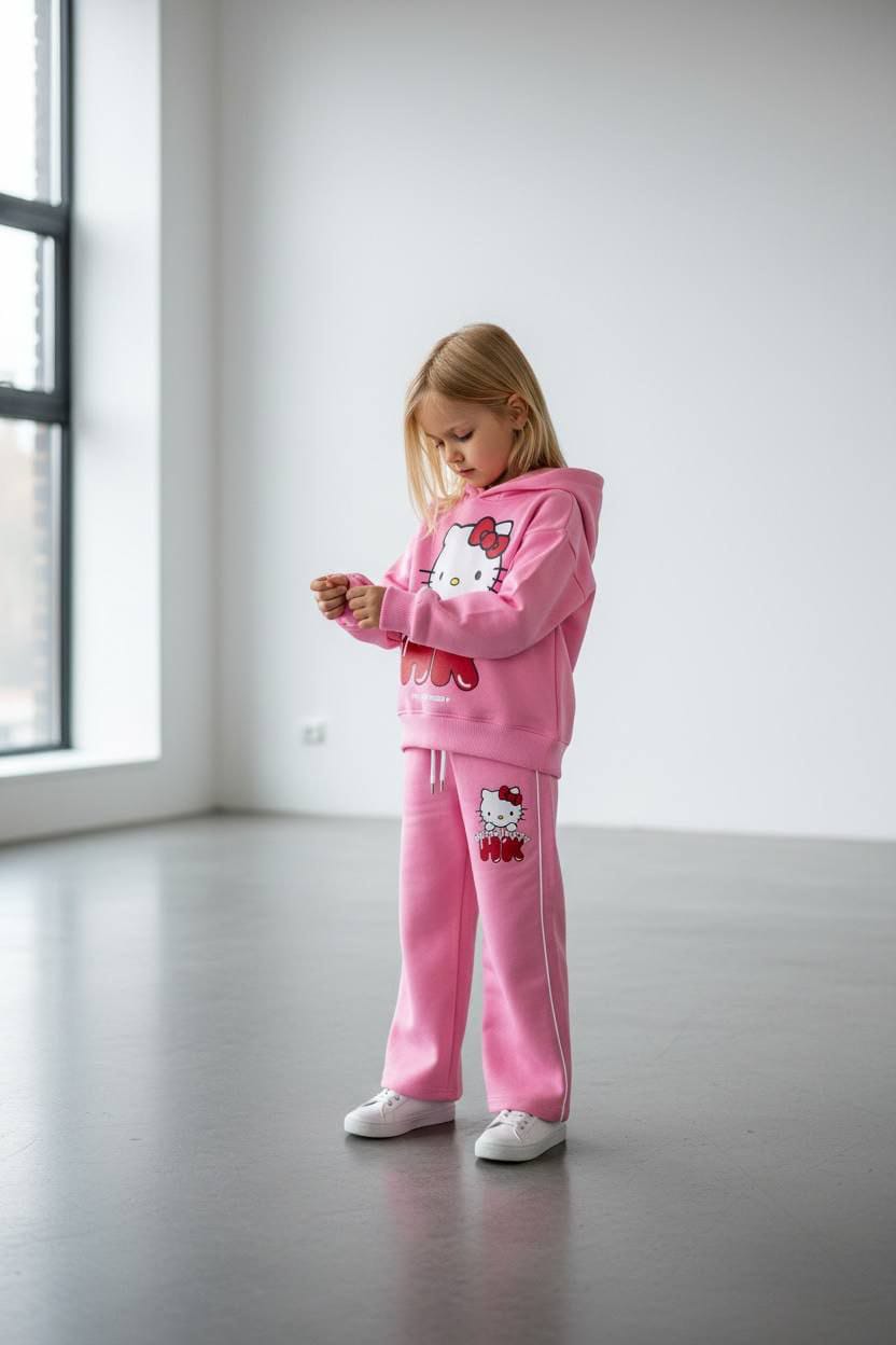 Anahtar Kelimeler: Hello Kitty, çocuk takımı, kapüşonlu ceket, pamuklu kumaş, rahat giysi.