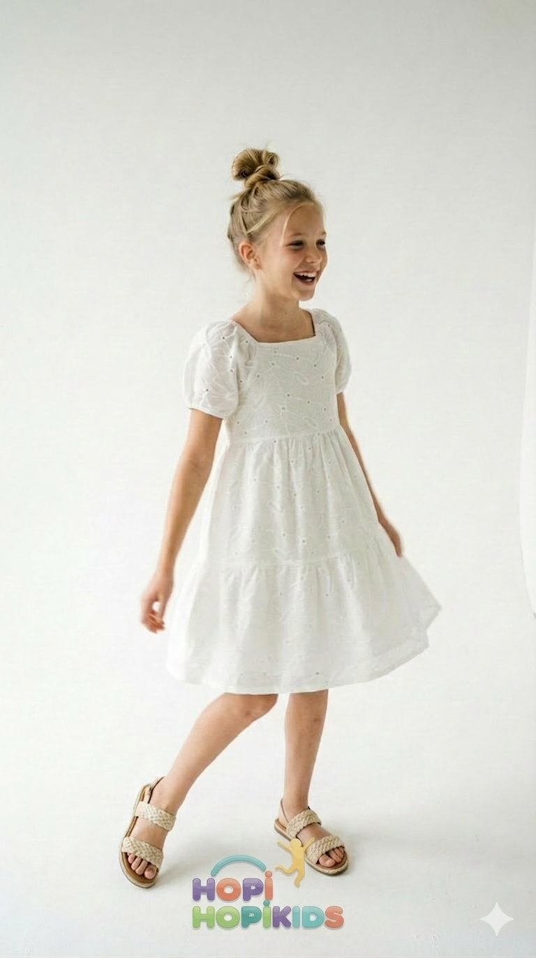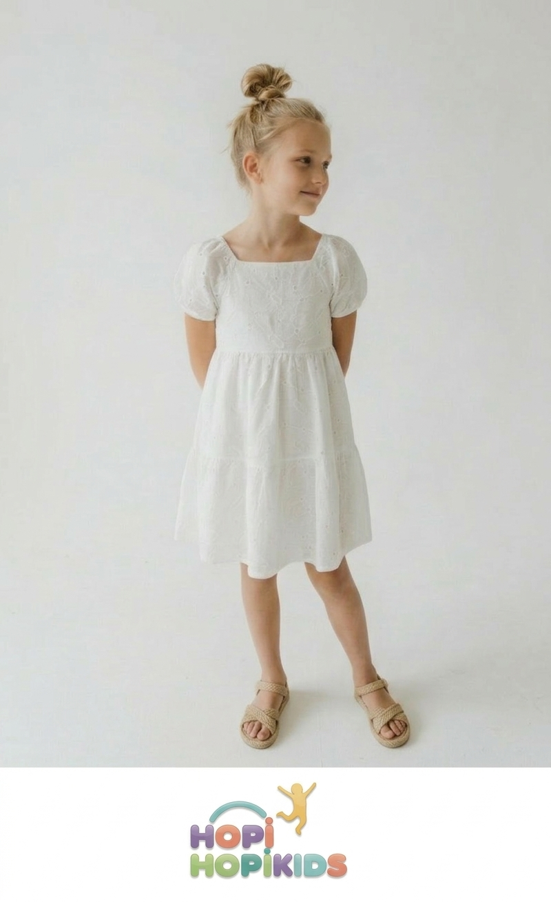 Bu beyaz kısa kollu elbise, hem yaz pikniklerinde hem de doğum günleri gibi özel günlerde giyilebilecek mükemmel bir seçenektir. Üzerinde bulunan zarif desenler ve işçilik detayları sayesinde dikkat çekici bir görünüm sunar. Ayrıca, bel kısmındaki lastik detayı, elbisenin vücuda oturmasını sağlar ve çocukların rahat hareket etmesine olanak tanır.